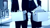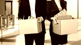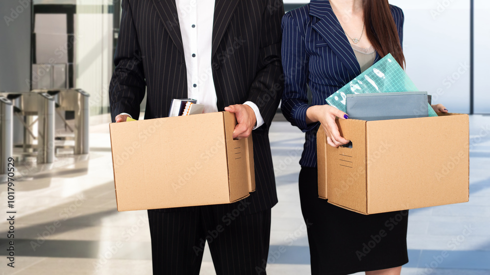Dismissal boxes in hands of office employees. Clerks leave building after dismissal. Dismissal box with personal items. Cropped man and woman lost their jobs. Reduction of company employees