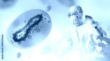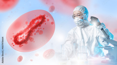 Doctor virologist. Monkey and smallpox molecule. Woman epidemiologist sits at table with microscope. Virologist studies dangerous bacteria. Examination monkeypox. Woman virologist in protection suit