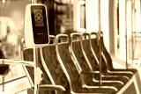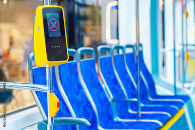 Payment terminal on bus. Broken toll validator. Non-working payment terminal. Bus interior. Empty public transport from inside. Bus payment terminal error. NFC credit card validator in metro