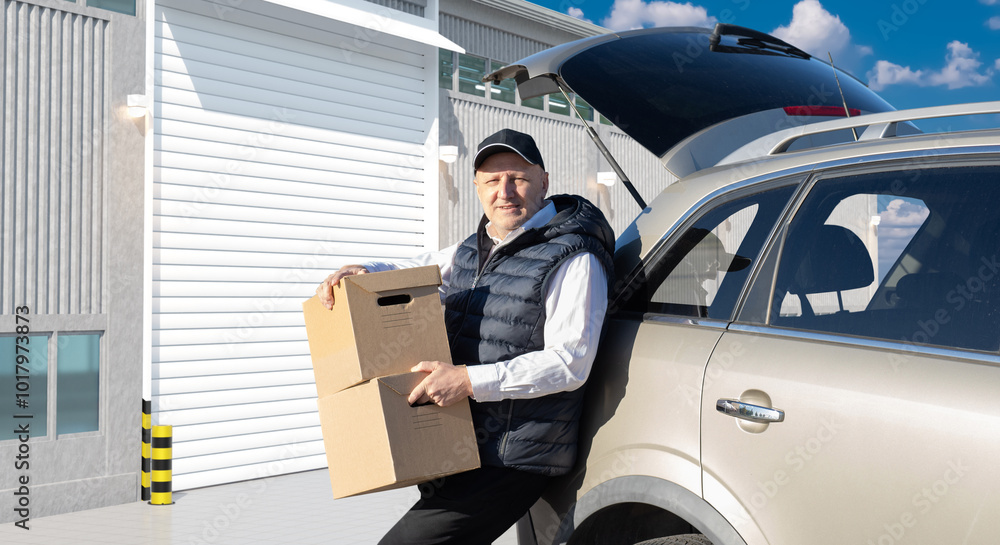 Man with boxes stands near warehouse. Guy picks up goods from factory. Man took boxes out of car. Businessman with parcels near warehouse building. Human with boxes smiles. Warehouse contractor