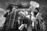 Security cameras near country house. Pole with CCTV. Security cameras in village. CCTV near two-story cottage. Security cameras for territory protection. Surveillance equipment under night sky