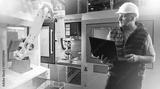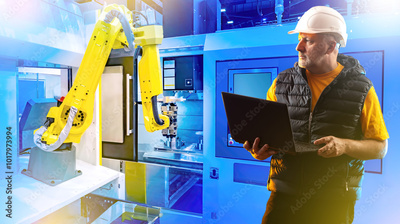 Modern industrial equipment. Man engineer. Arm manipulator near programmer. Industrial technologies. Robot hand for production. Yellow arm manipulator close-up. Man introduces robot into production