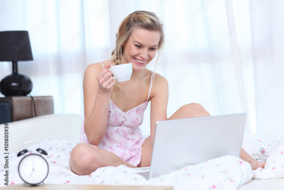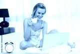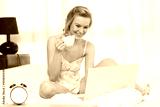 Pretty woman taking a pill sitting on bed at home