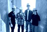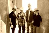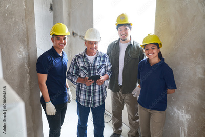 High angle portrait of smiling senior contractor with workers wearing hardhats standing together at incomplete corridor