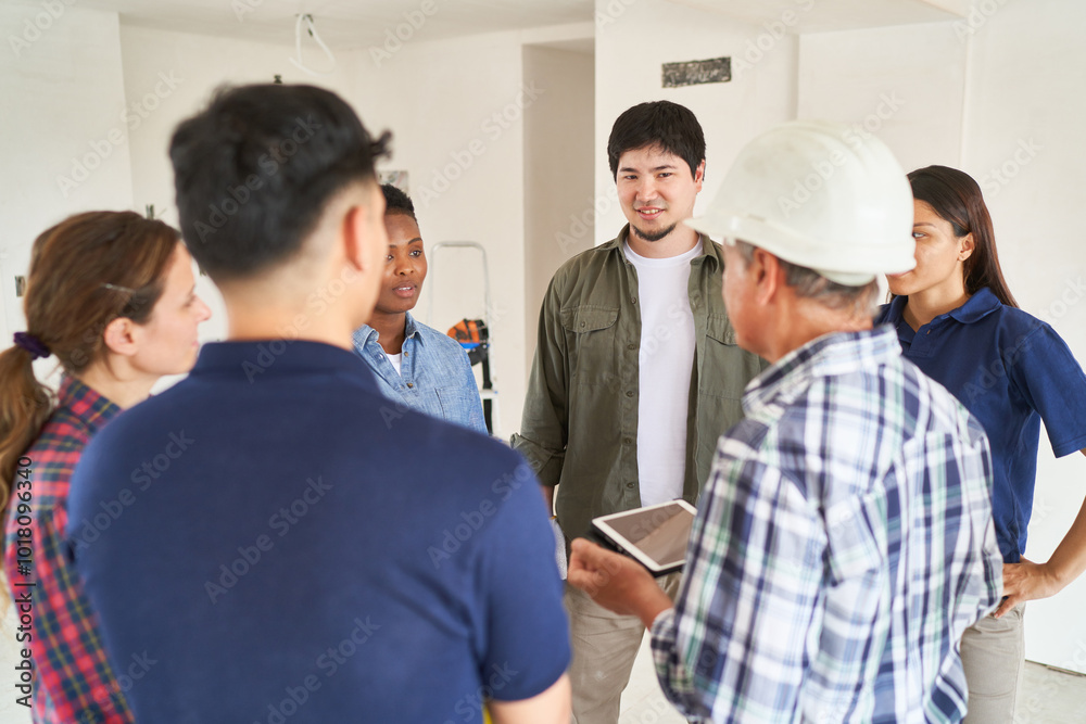 Senior architect discussing with construction coworkers while standing inside incomplete house
