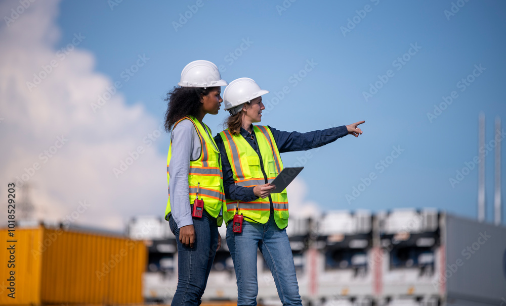 Engineer or dockworker working in the construction container dock yard checking and inspection containers data on computer program environment is container shipping Logistics business concept.
