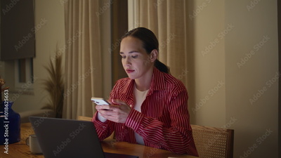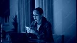 Girl shopping mobile phone at home closeup. Pensive woman texting social media
