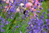 trzmiel na lawendzie, trzmiel na kwitach lawendy na różowym tle, bumblebee on lavender, bumblebee on lavender flowers on a pink background
