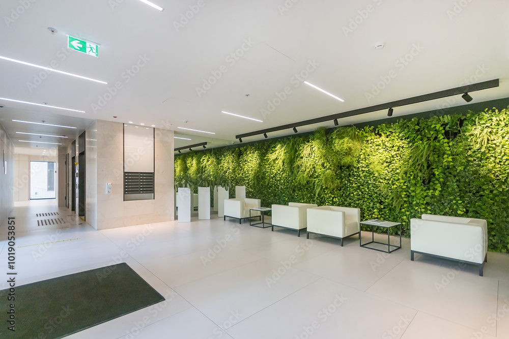 Exclusive design of the lobby of the office center. White armchairs and tables against .the wall decorated with green plants.