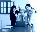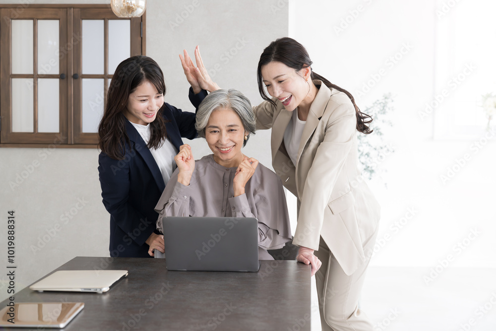 幅広い年齢層の女性チームで働く複数のビジネスマン 成功や業績が好調でみんなで喜ぶハイタッチ