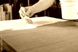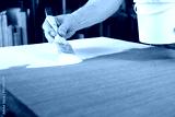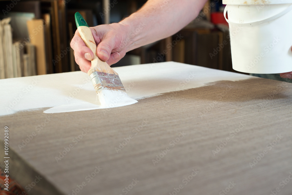 An artist priming canvas