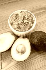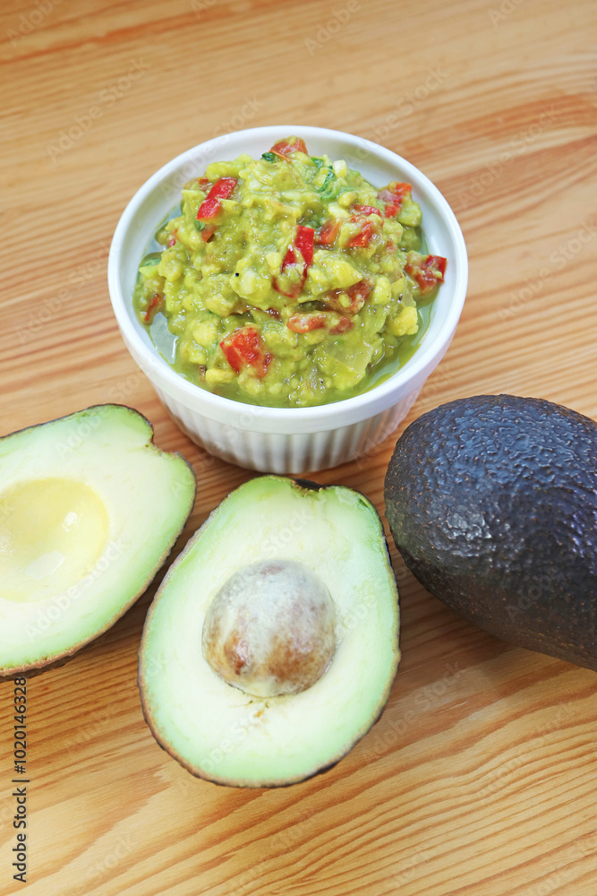 Tasty Guacamole with Heap of Fresh Avocadoes on Wooden Background