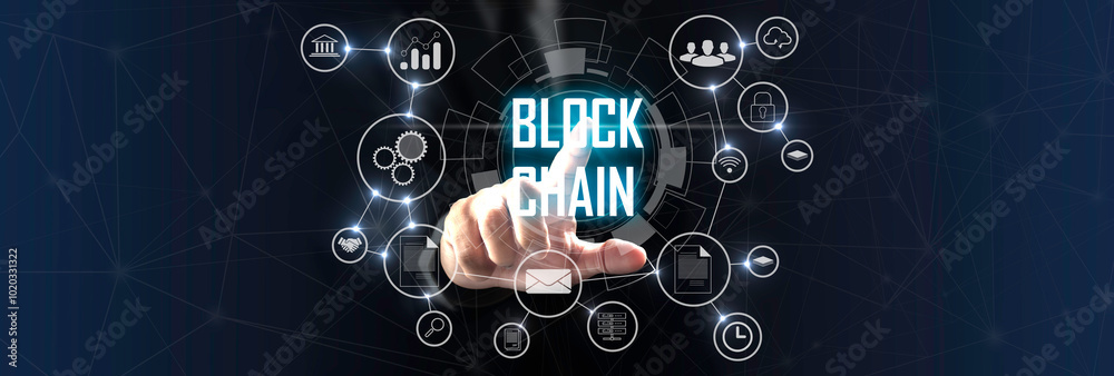 businessman touching a smart contract and executing a cryptocurrency transaction with blockchain technology. The transaction is secure and transparent, and there are other people in the background.