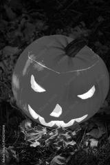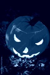 glowing, carved jackolantern in a dimly lit forest, celebrating Halloween