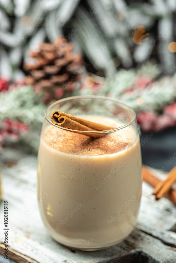 Homemade eggnog with cinnamon in glass on wooden board. Typical Christmas dessert. vertical image. top view. copy space for text