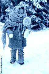 cute baby, girl 2 years old in warm winter retro clothes with caramel candy in winter forest, baby is wrapped in knitted shawl, beautiful landscape, snow-covered fluffy fir trees