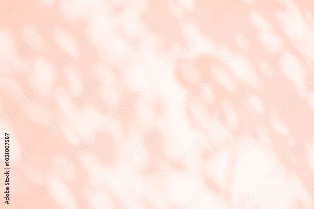 Light and shadow pink beige pastel abstract blur background. Natural leaves shadows and sunshine diagonal refraction on white wall texture. Shadow overlay effect foliage mockup banner graphic layout