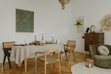 Elegant holiday dining room. A modern dining setup with candles, natural elements, and stylish chairs. Perfect for christmas gatherings.