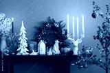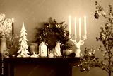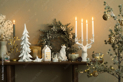 Interior design of christmas living room interior with wooden console, stylish candlestick with candle, christmass tree and personal accessories. Home decor. Template.
