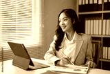 Young businesswoman is reviewing data and smiling while working in her office