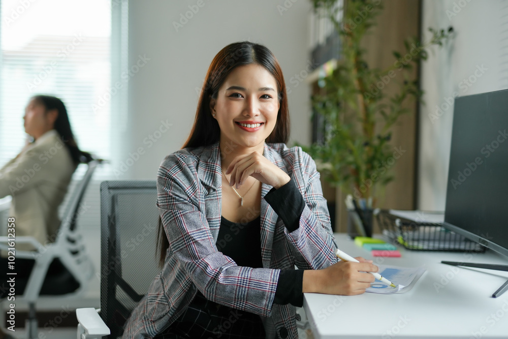 Young asian manager woman smiling while working on charts and graphs, sitting at her desk in a modern office