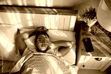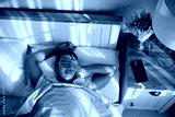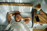 Above view of grumpy woman covering her eyes while waking up in bed in morning.