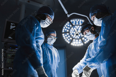 Team of professional doctors performing operation in surgery room. Healthcare medical help concept
