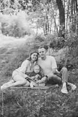 A family of a mother and father with a child in their arms, sitting in the park in the summer. The concept of a happy family with a small child, care and love. Happy family with a child.