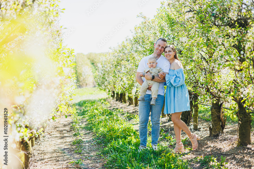 A young married couple, a man, a woman and a little son, are walking in the park. Time for a walk, mom, dad and small child.