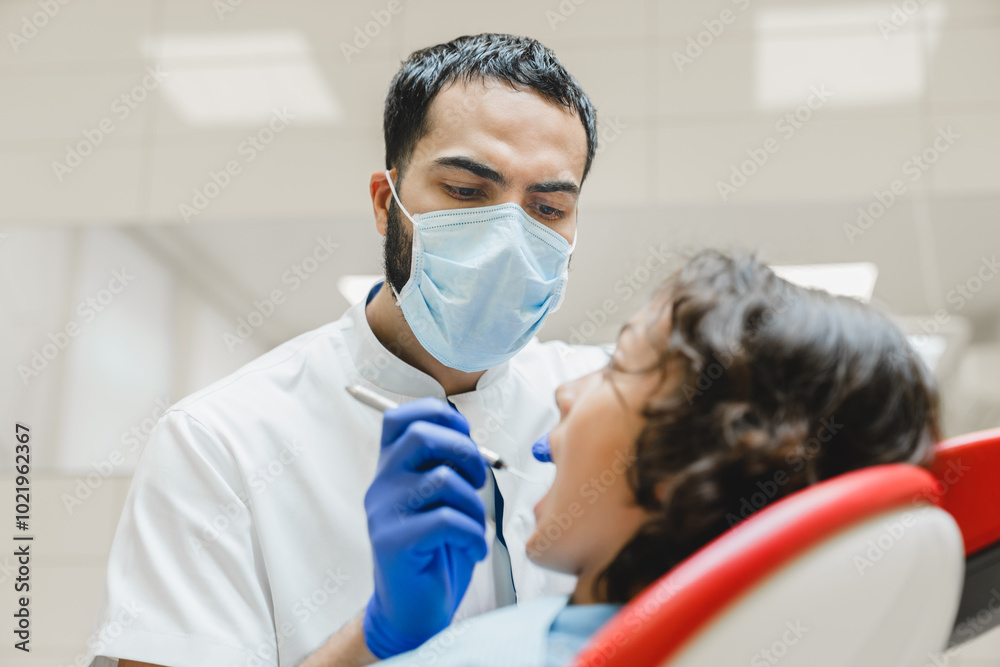 Middle-Eastern male dentist orthodontist in protective face mask curing operating filling kid`s boy`s teeth, healing caries decay. Children stomatology concept