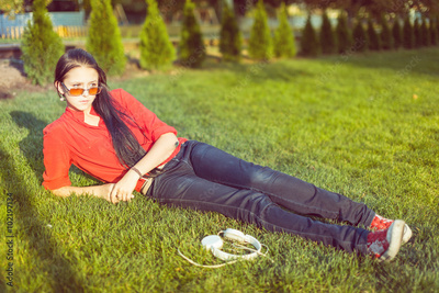 lifestyle, summer vacation, technology, music, leisure and people concept - smiling young girl in headphones lying with closed eyes on grass.