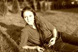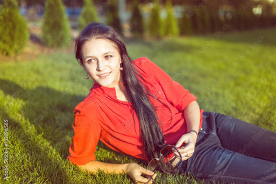 portrait of romantic, young woman (meadow, prairie) , dreams.
