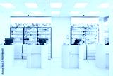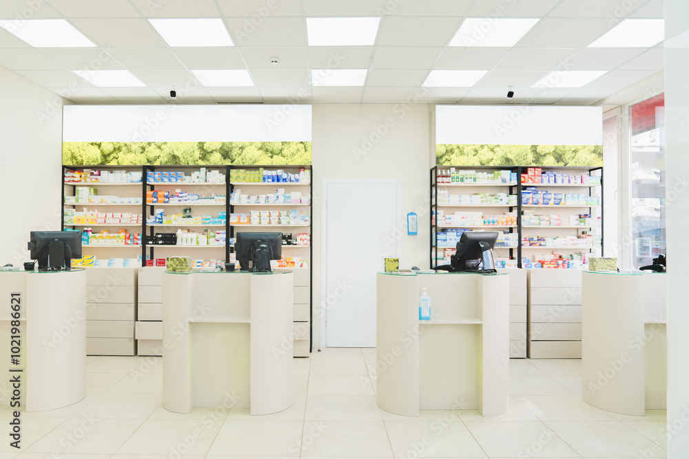 Four empty without visitors clients staff cash point desks at pharmacy drugstore chemist`s store with white shelves full of medicines, jars with pills, remedy