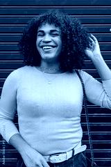 Cheerful transgender woman in yellow clothes posing and smiling to the camera over black background.