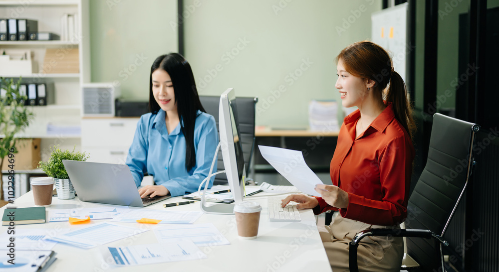 Asian business colleague business presents and explains and using laptop and tablet. Teamwork, financial