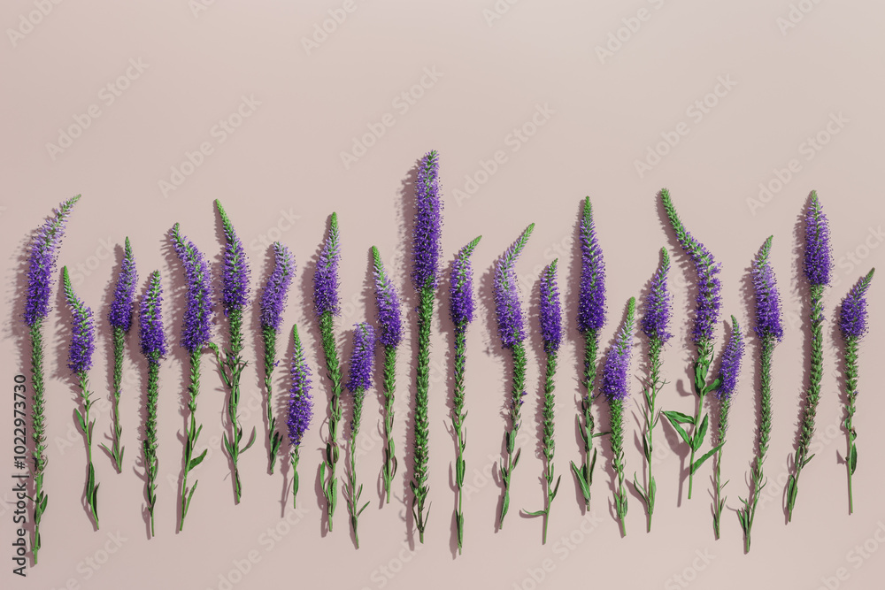 Natural blooming Purple close up flowers as trend minimal layout on pale pink light background, minimal trend aesthetic floral overview photo. Beautiful nature still life with wildflowers Veronica