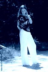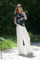 Woman in summer blouse and wide white trousers enjoying idyllic summer day in the countryside