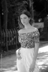 Woman in summer blouse and wide white trousers enjoying idyllic summer day in the countryside