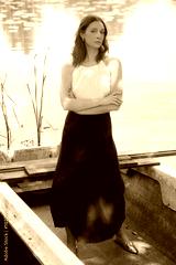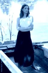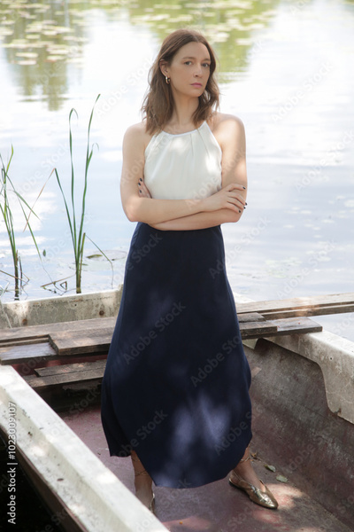 Woman in white blouse and linen blue skirt enjoying idyllic summer day in the countryside