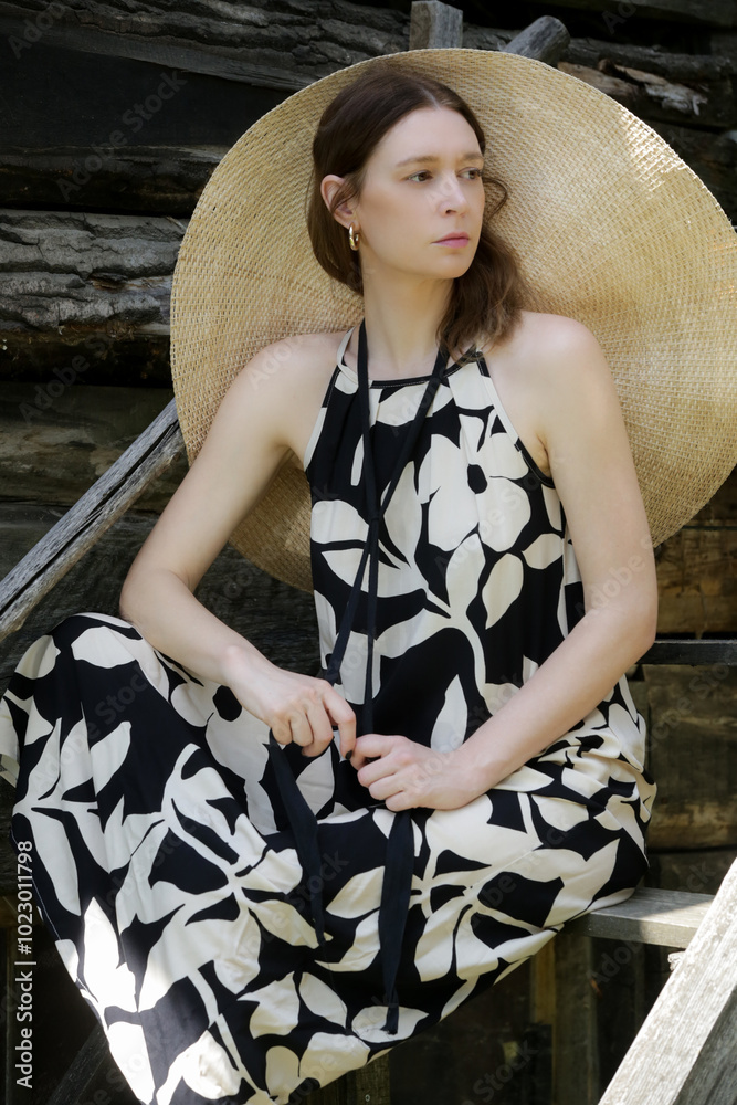 Woman in long summer dress enjoying day in the countryside