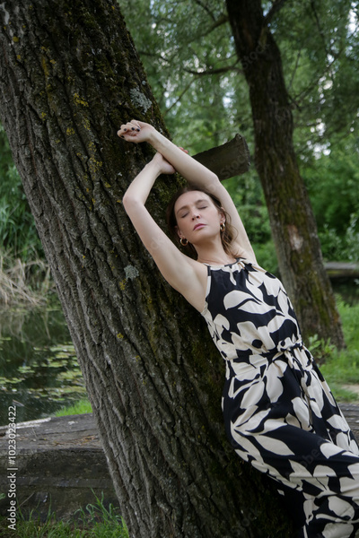 Woman in long summer dress enjoying day in the countryside