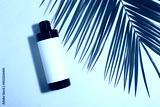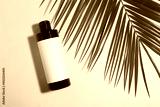 Bottle of shampoo and palm leaf on beige background, flat lay