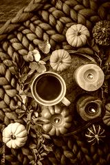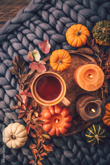 Cozy still life with fruit tea, pumpkins and candles for autumn days and Thanksgiving