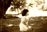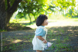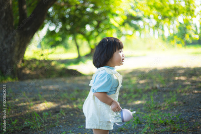 Cute 1 year old white girl walking in a green park at sunset in summer. Concept of fun childhood and active hobby.