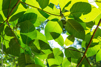 Leaves and trees backlit,Sun shines through the young leaves of the tree. Green leaf macro in spring day sun rays on blurred abstract bokeh with flare background