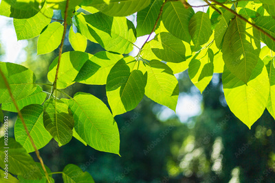 Leaves and trees backlit,Sun shines through the young leaves of the tree. Green leaf macro in spring day sun rays on blurred abstract bokeh with flare background