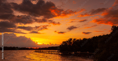 Coast and mangrove forest in the evening in Thailand,Tropical mangrove forest under sunlight with cloudy blue sky in phang nga bay, Thailand.