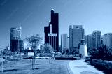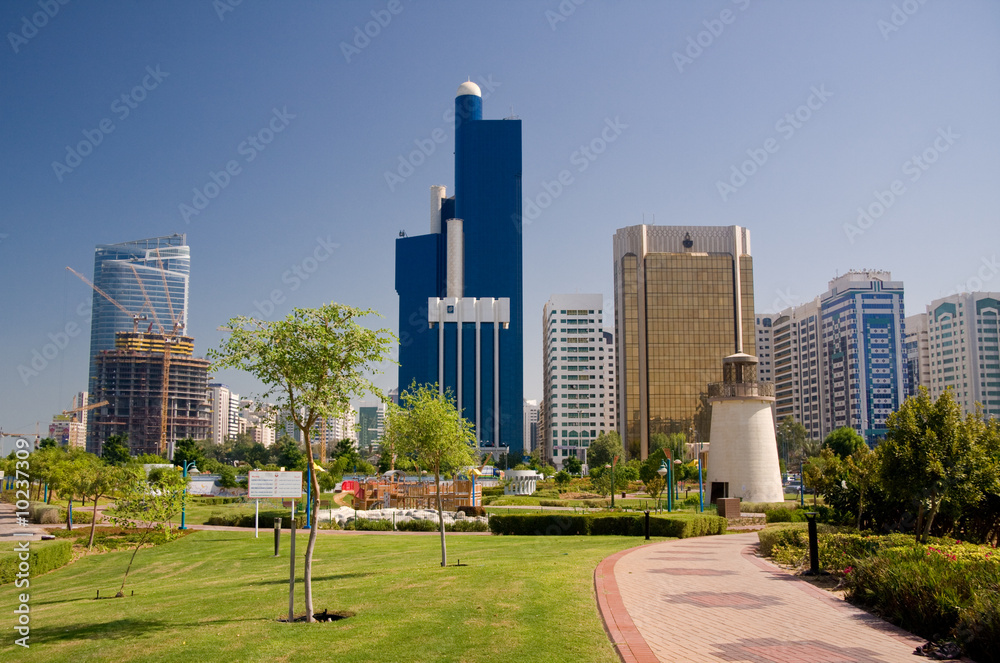 View of Abu Dhabi Skyline with gardens and small lighthouse