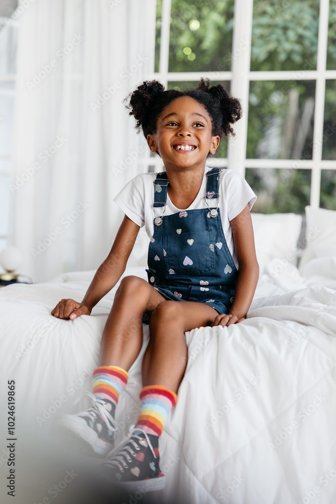 Happy young girl sitting on a bed smiling with joy