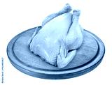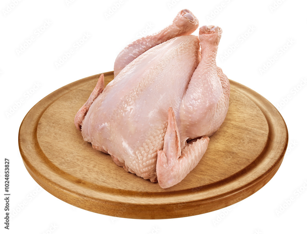 frango inteiro cru sobre tábua de servir de madeira isolado em fundo transparente